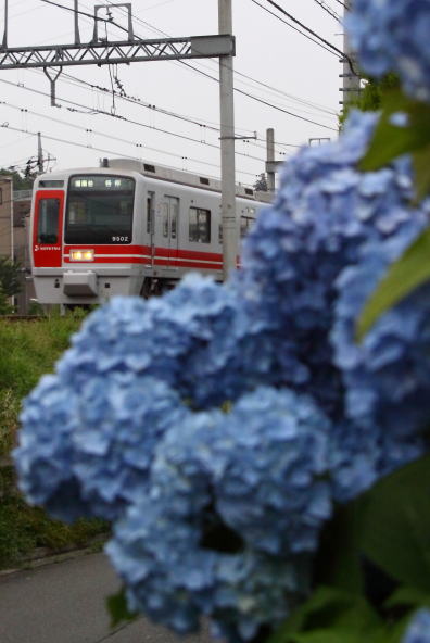 本当は青紫のアジサイがよかったのですが見つからなかったので、西谷〜鶴ヶ峰間にある青いアジサイとの組み合わせを狙いました。